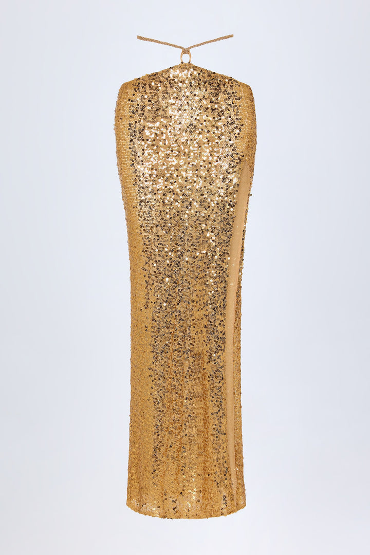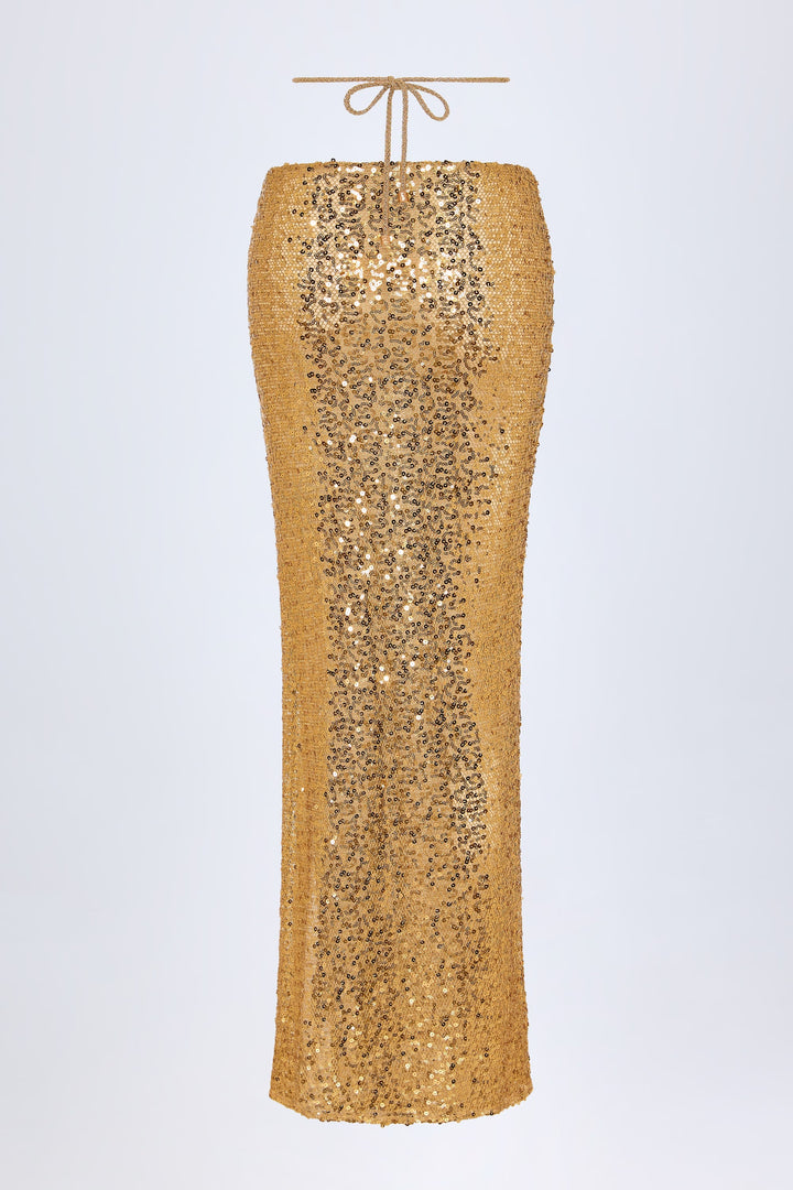 Altın Rengi Süslemeli Donanım Detaylı Askılı Maksi Etek