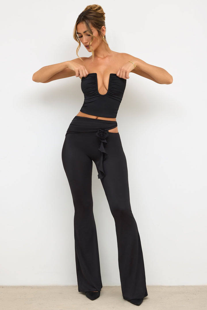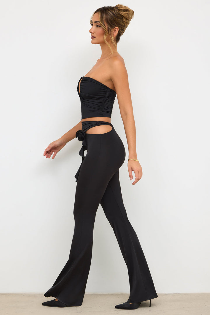 Siyah Petite Premium Jersey Gül Detaylı Orta Bel Flare Pantolon