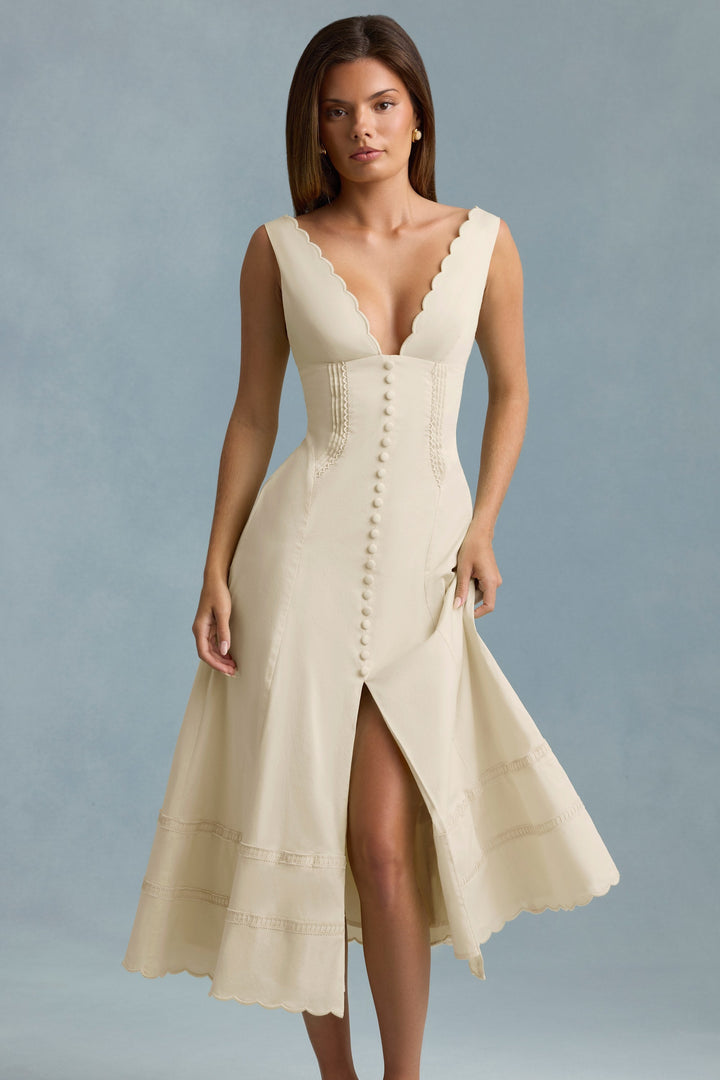 Fildişi Pamuklu Poplin A Kesim Midaxi Elbise