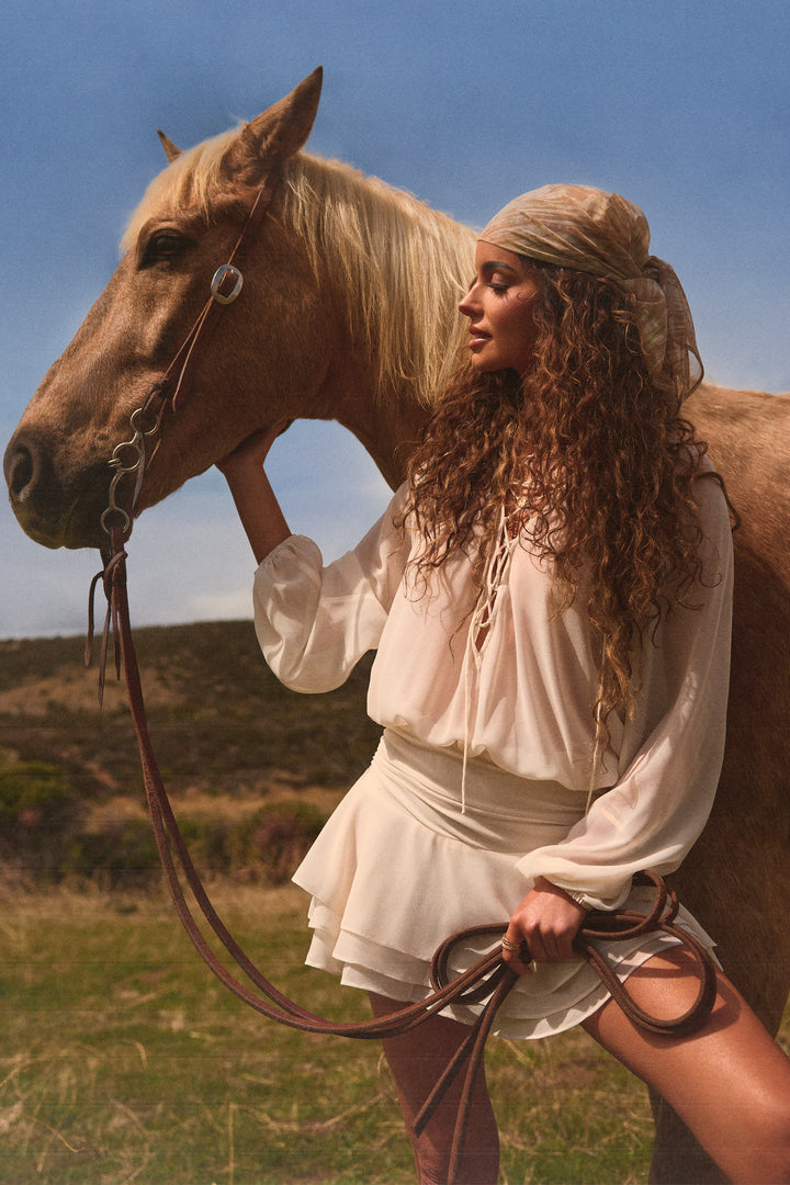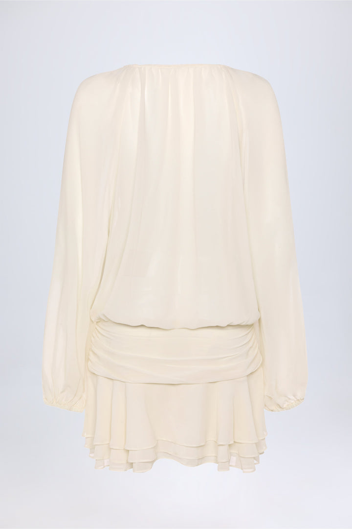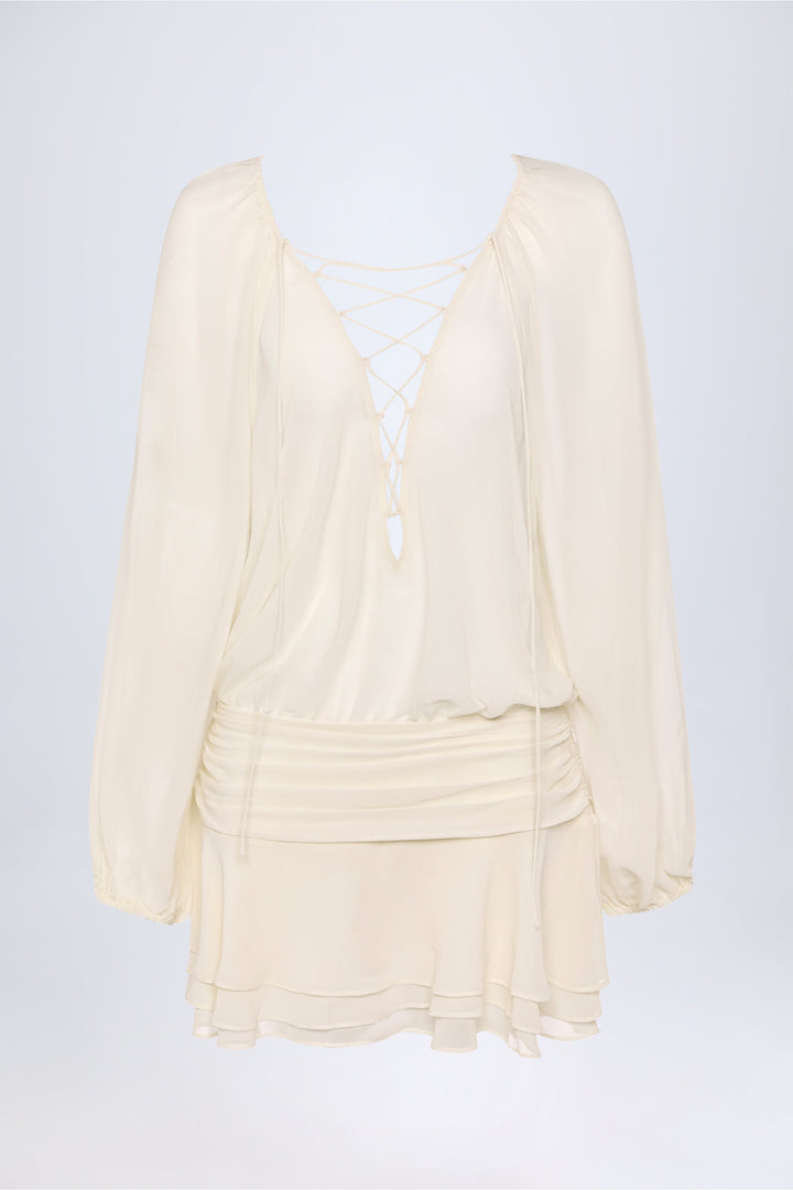 Fildişi Rengi Bağcıklı Balon Kollu Mini Elbise