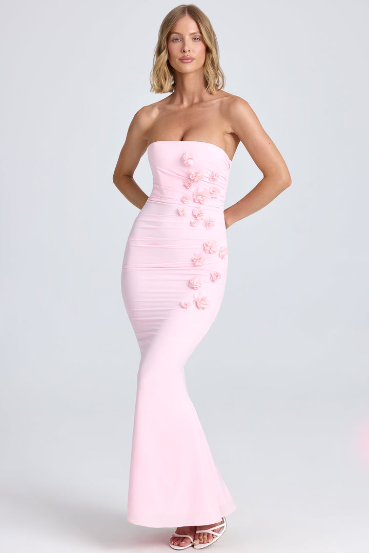 Blush Rengi Drapeli Çiçek Aplikeli Uzun Elbise