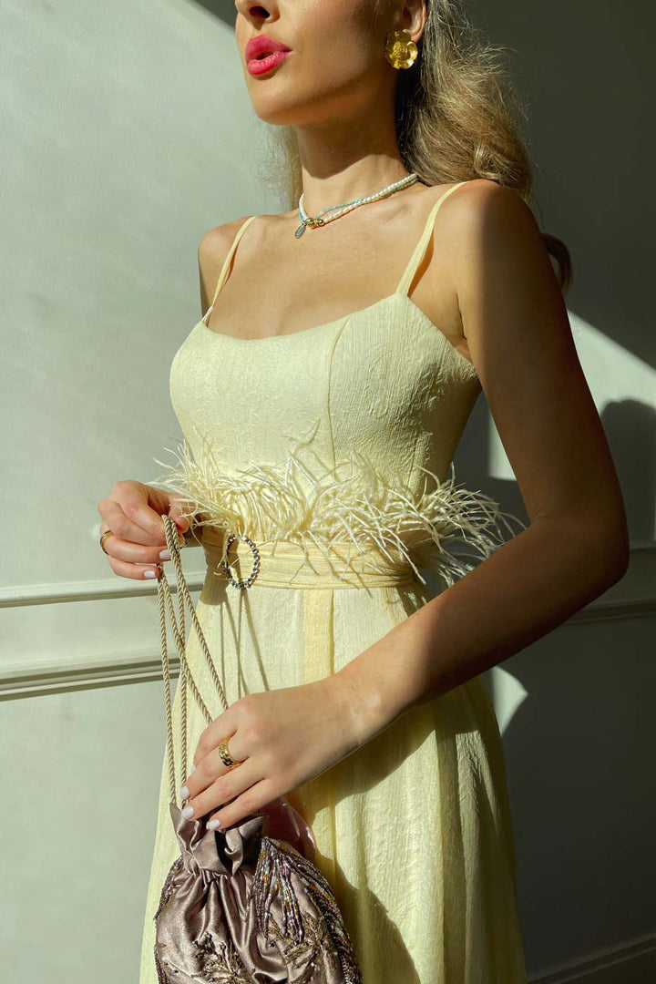 Tüy Detaylı Kemerli Büstiyer Elbise