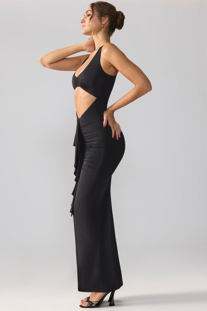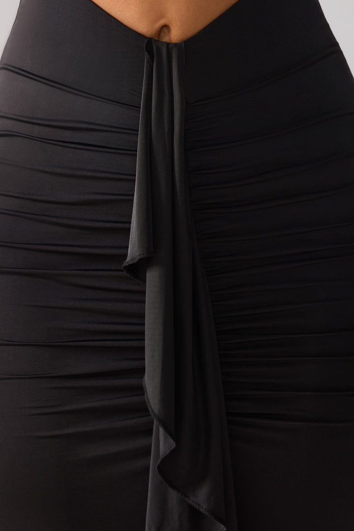 Siyah Slinky Jersey Kesimli Volanlı Sırtlı Uzun Elbise