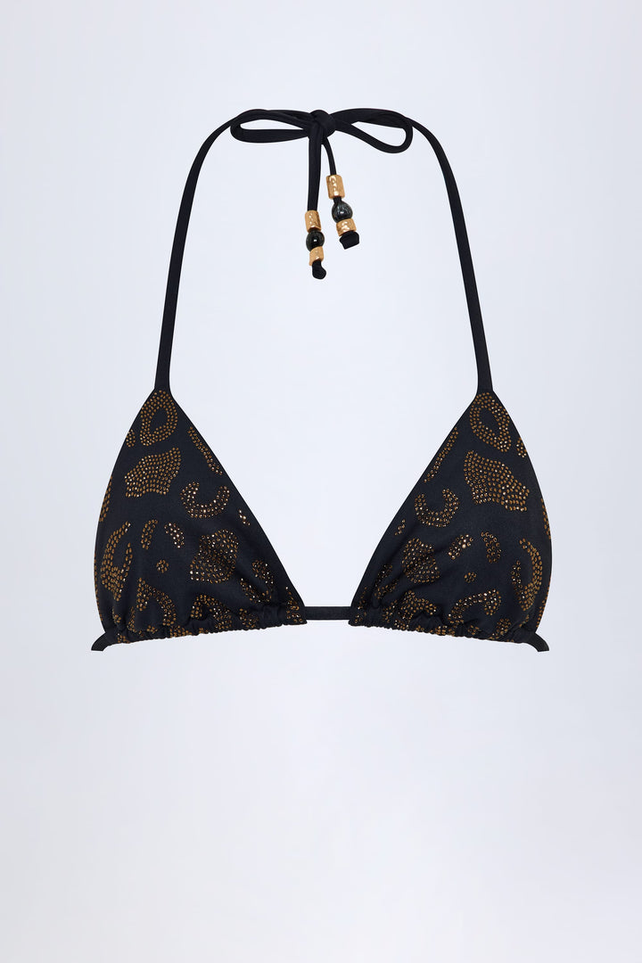 Siyah Leopar Desenli Boncuk Detaylı Üçgen Bikini Üstü Hotfix