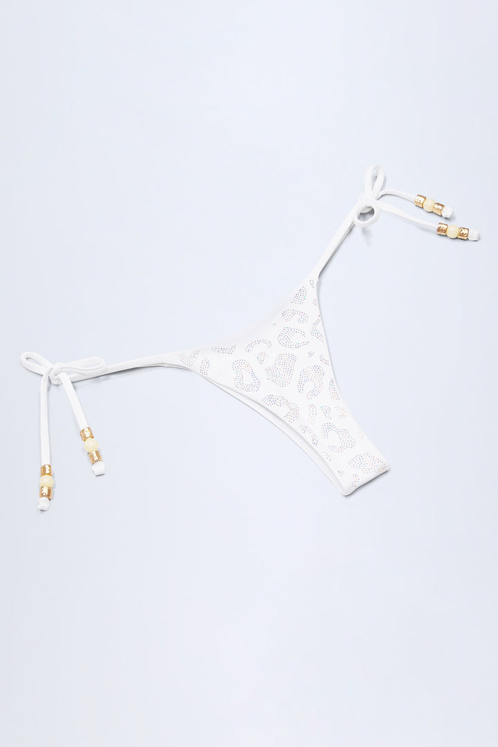 Beyaz Leopar Desenli Yan Bağlamalı Boncuklu Tanga Bikini Altı Hotfix
