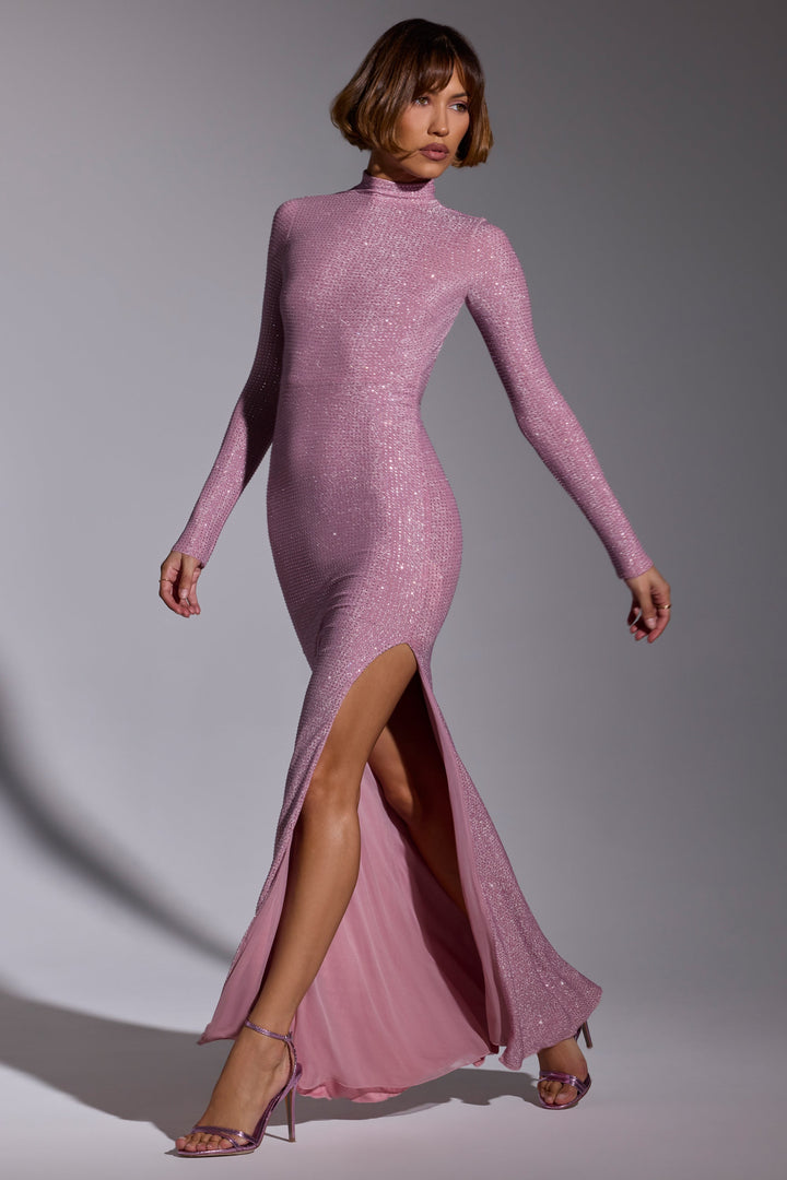 Açık Pembe Renkli Süslemeli Uzun Kollu Abiye Elbise