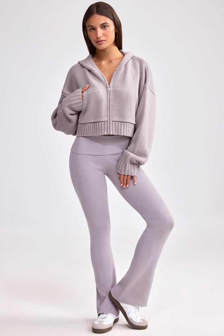 Tozlu Lavanta Rengi Kısa Fermuarlı Kalın Örgü Kapüşonlu Üst