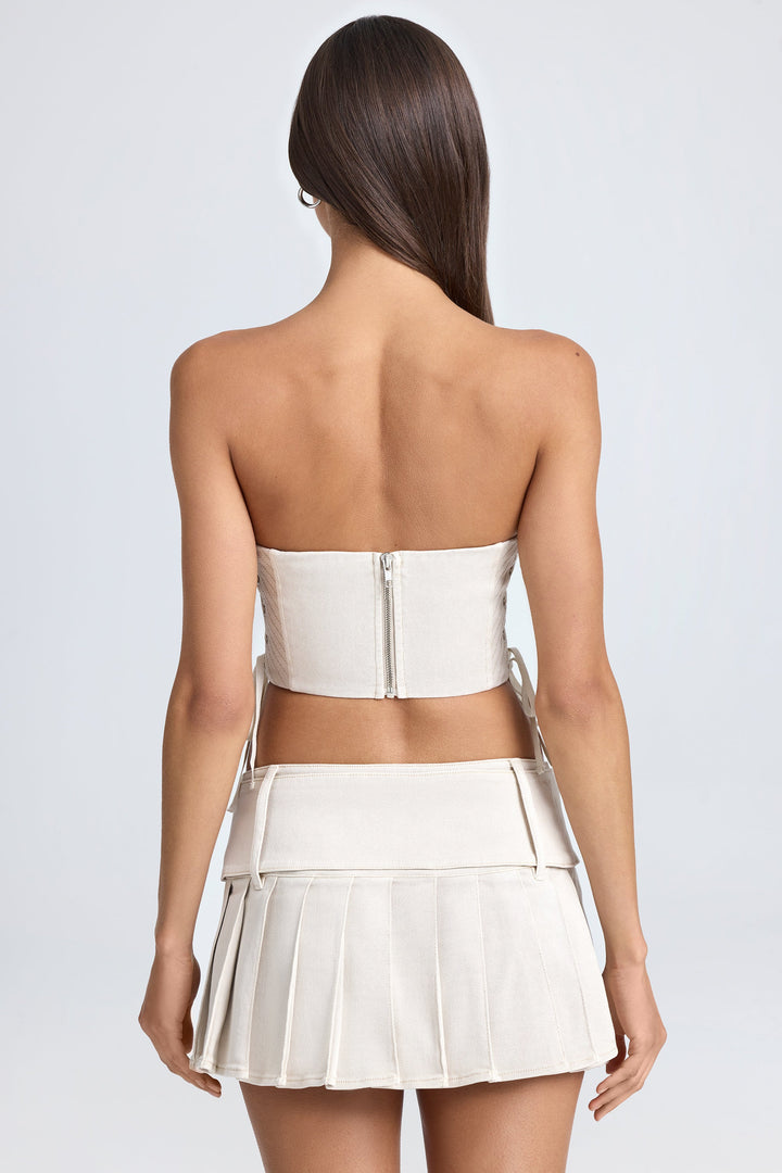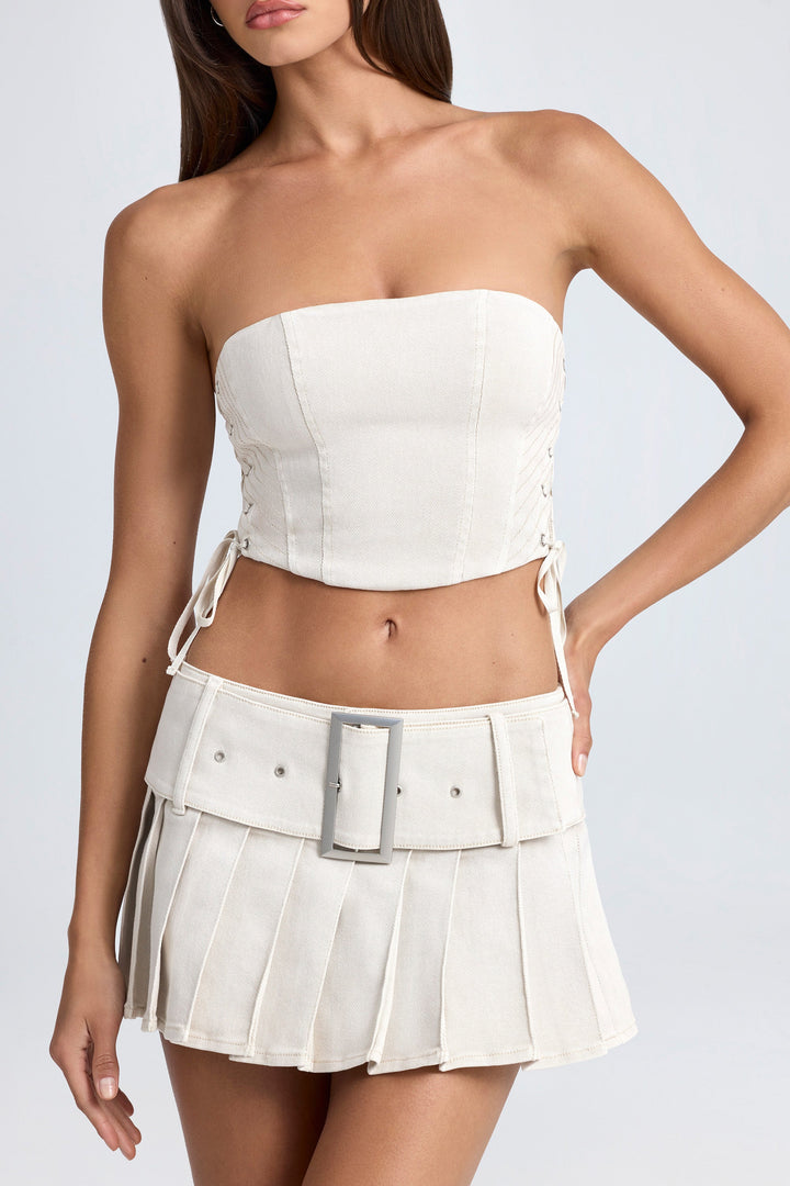 Ekru Renkli Kemerli Pileli Düşük Bel Mikro Mini Etek