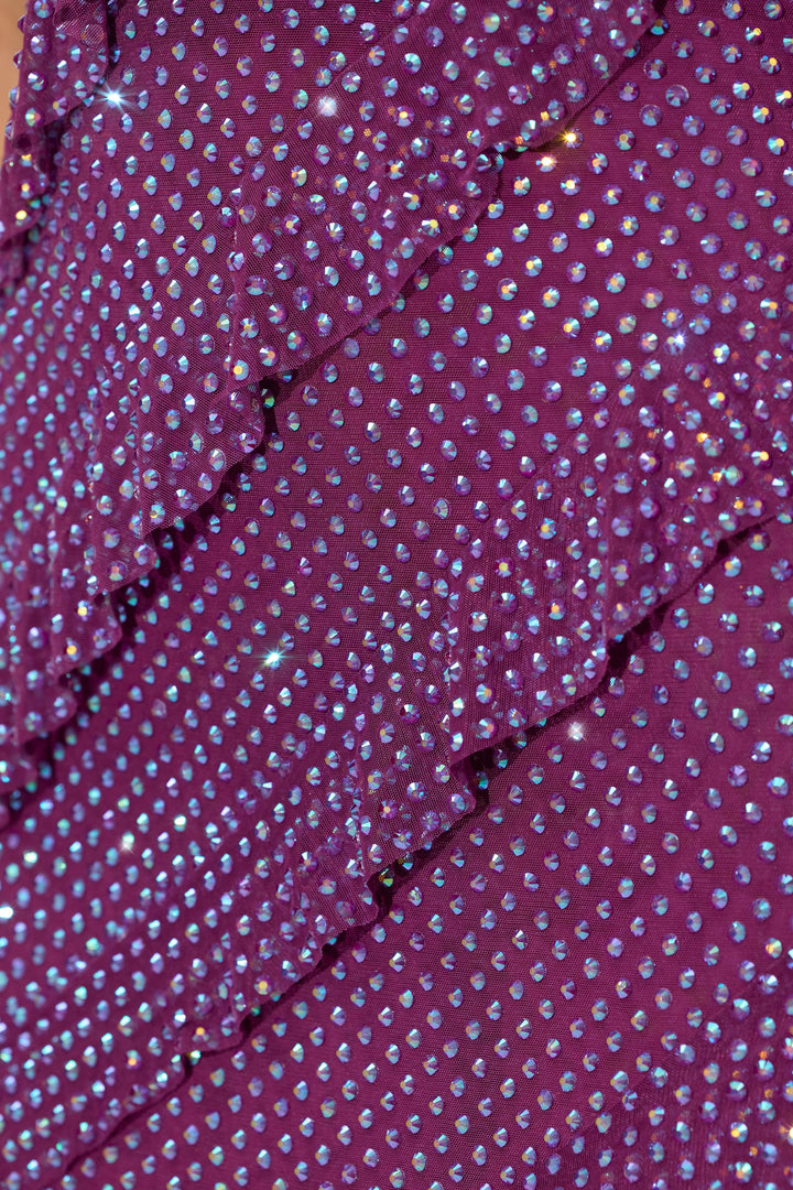 Erik Rengi Süslemeli Straplez Volanlı Uzun Elbise