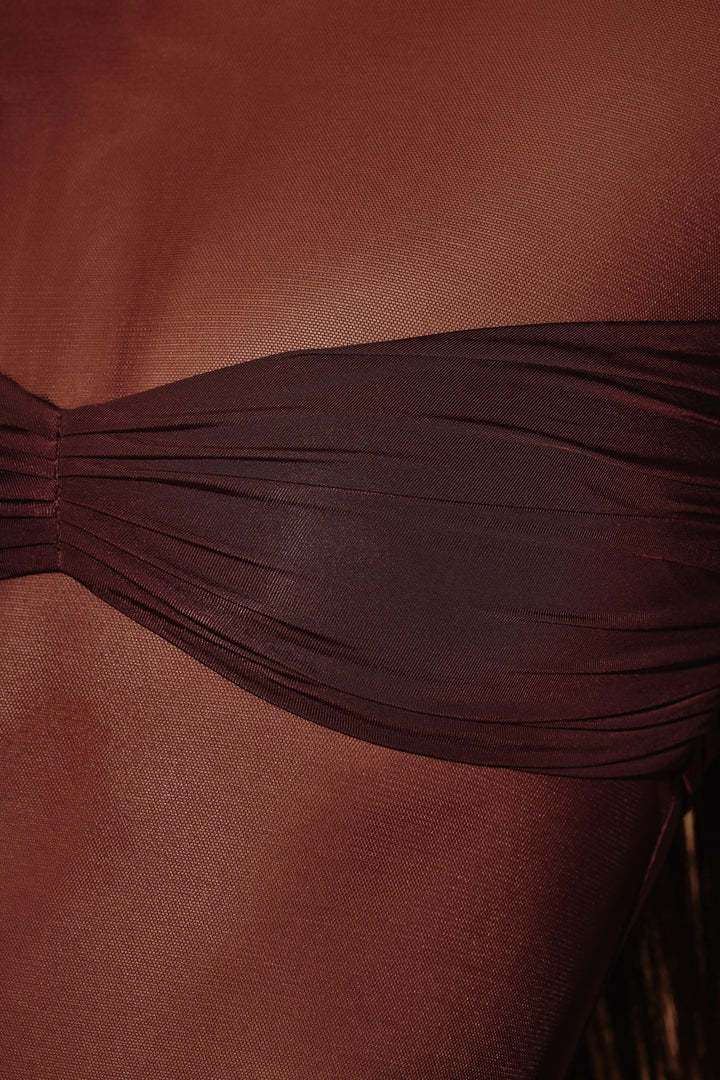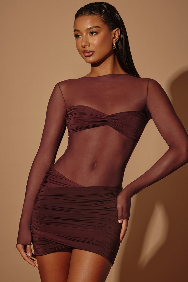 Kahverengi Şeffaf Panelli Uzun Kollu Mini Elbise