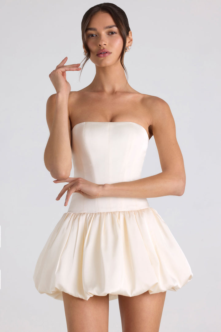 Fildişi Rengi Bağcıklı Balon Etekli Korse Mini Elbise