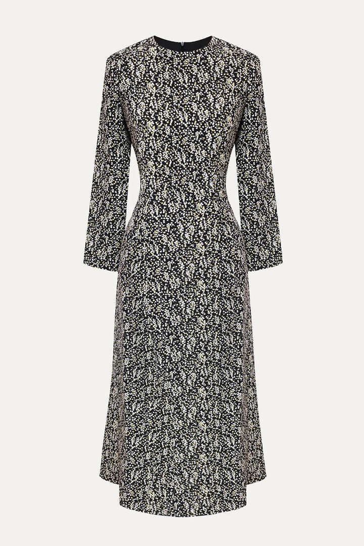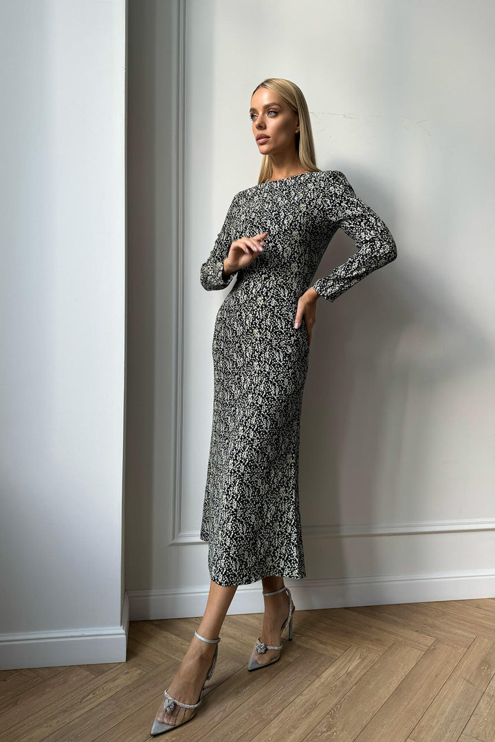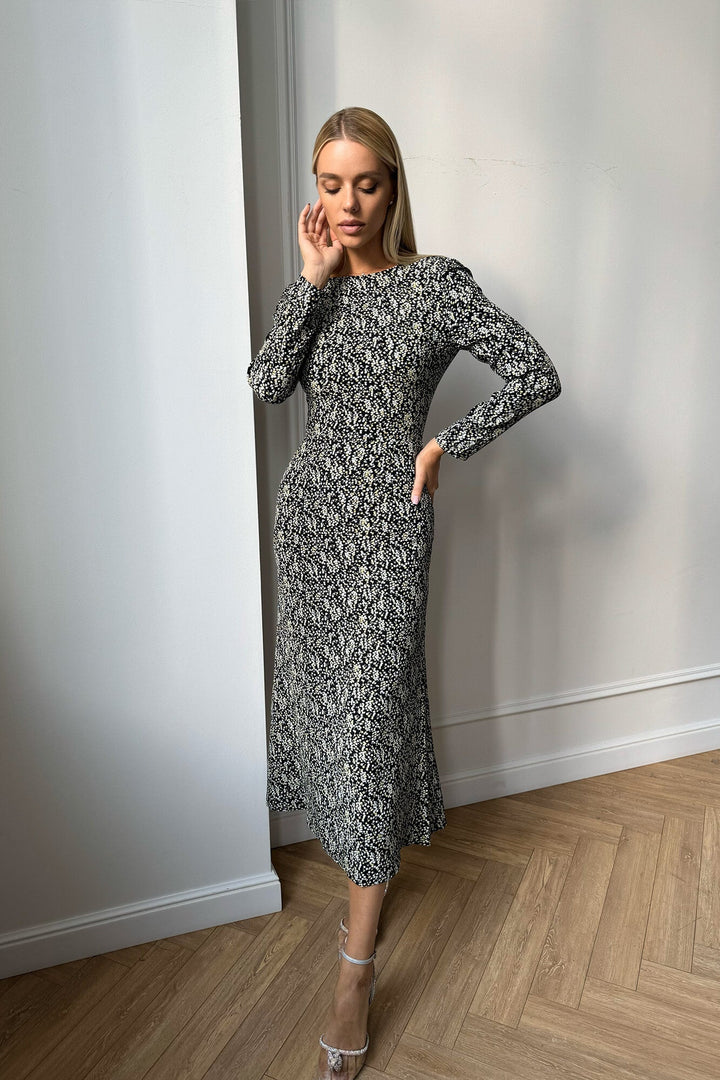 Godet Silhouette Uzun Kollu Çiçekli Midi Elbise