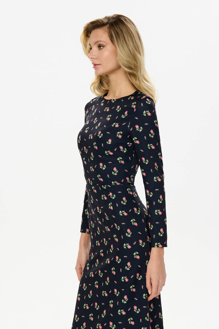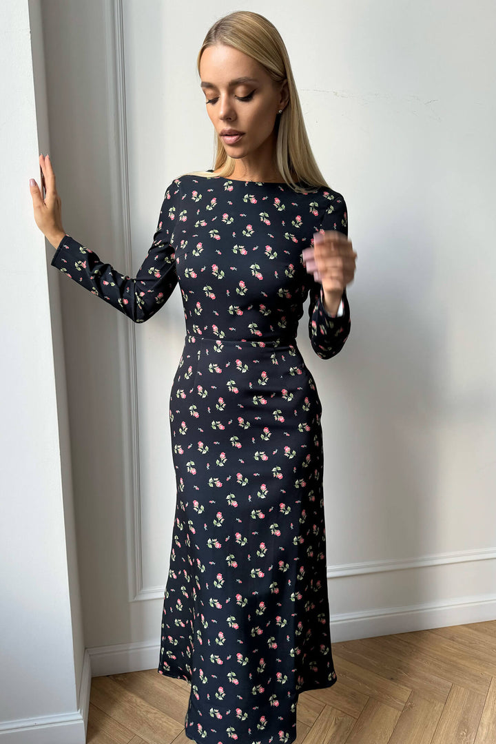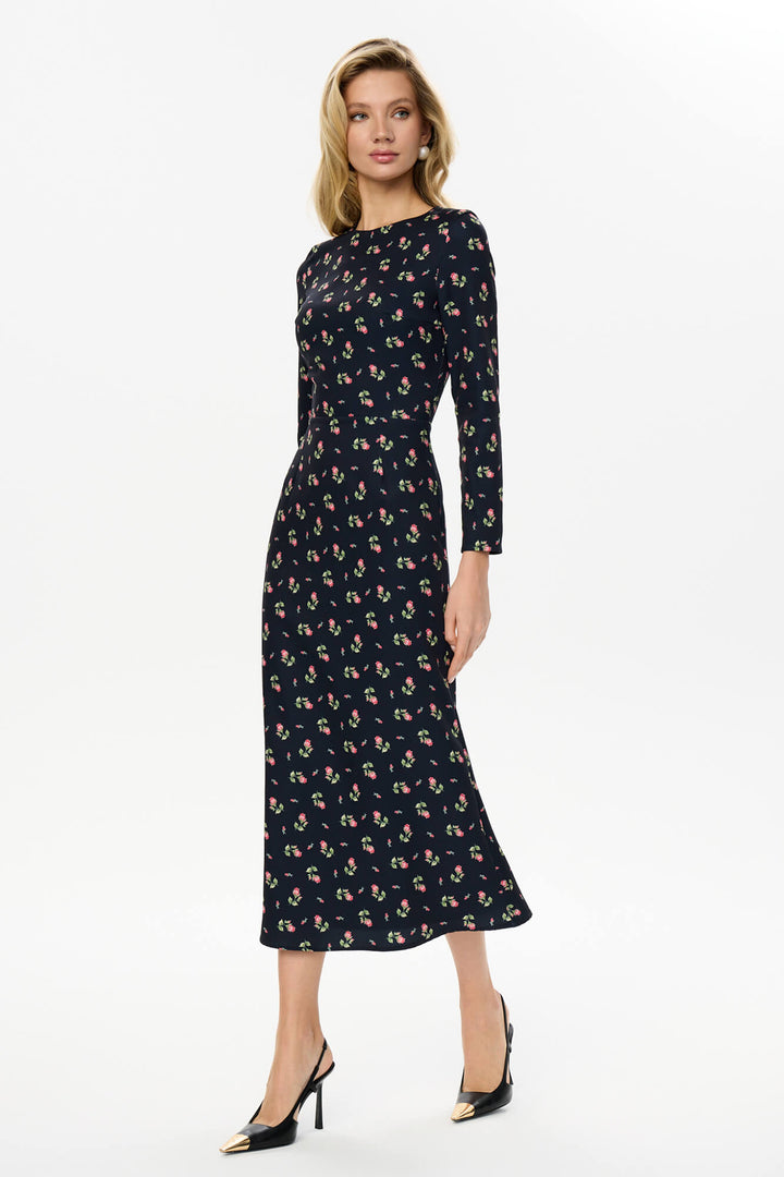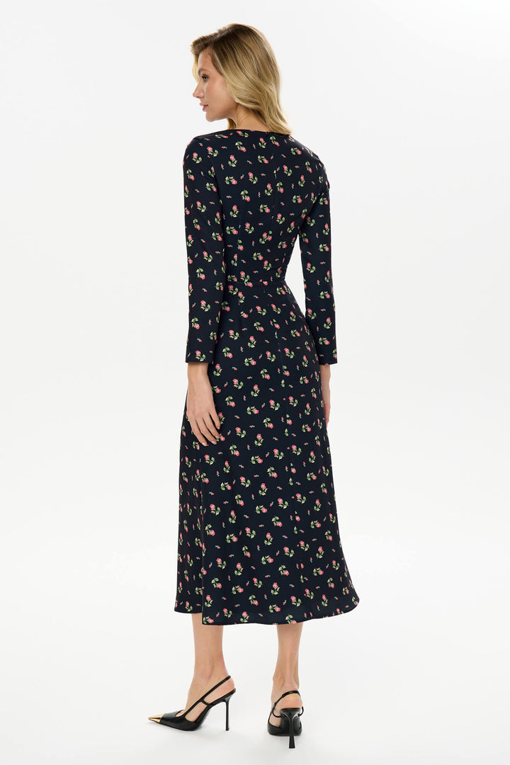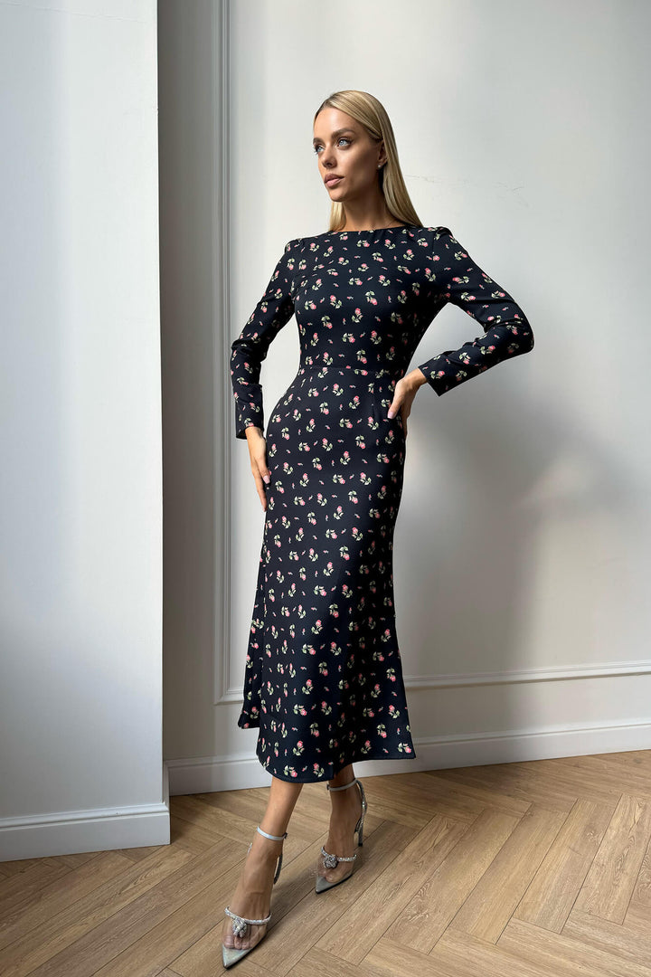 Godet Silhouette Uzun Kollu Çiçekli Midi Elbise