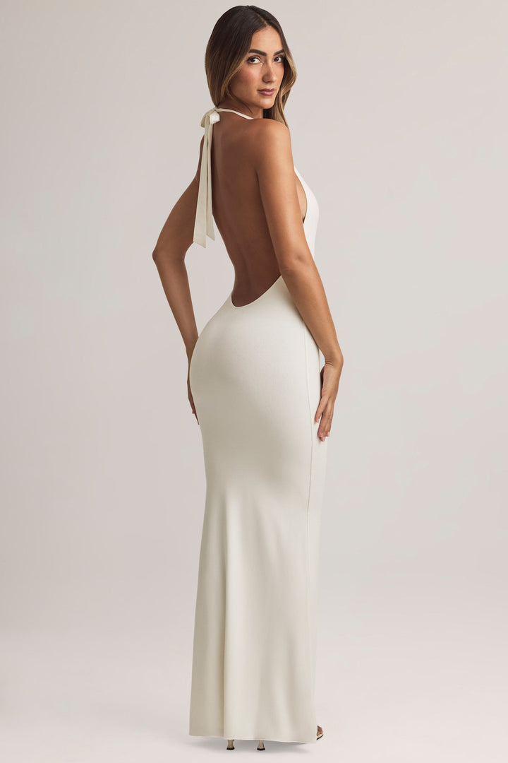 Beyaz Modal Halter Yaka Uzun Elbise