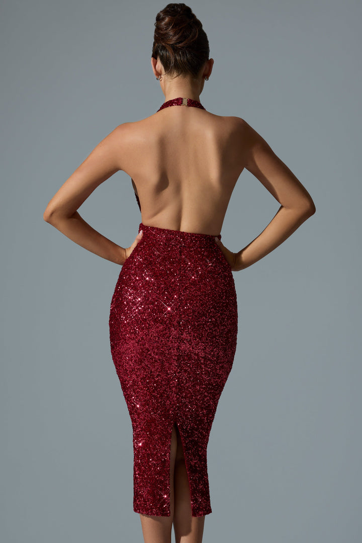 Kırmızı Renkli Süslemeli Kesikli Açık Sırtlı Midaxi Elbise
