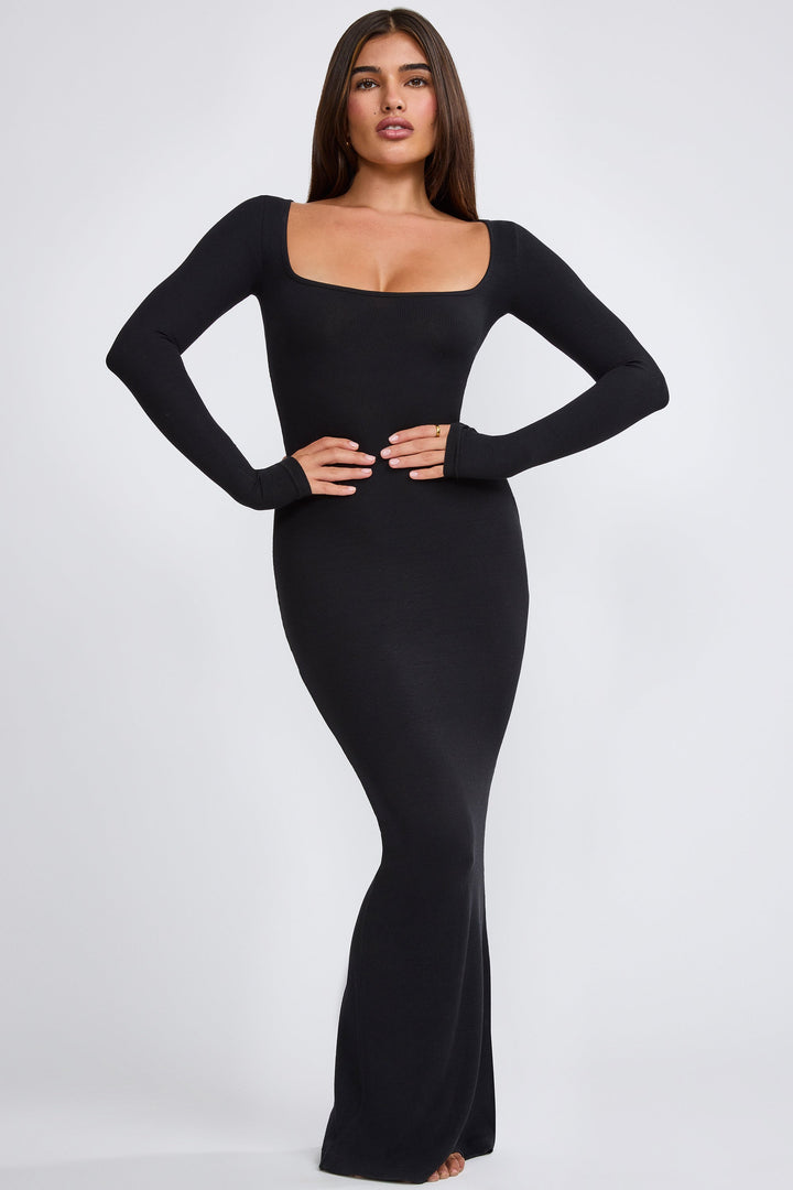Siyah Kaburgalı Modal Uzun Kollu Maksi Elbise