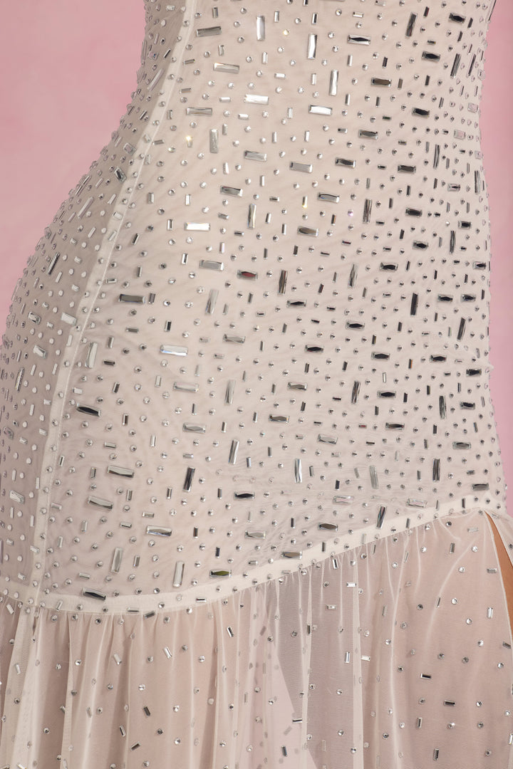 Beyaz Yarı Şeffaf Süslemeli Asimetrik Uzun Elbise