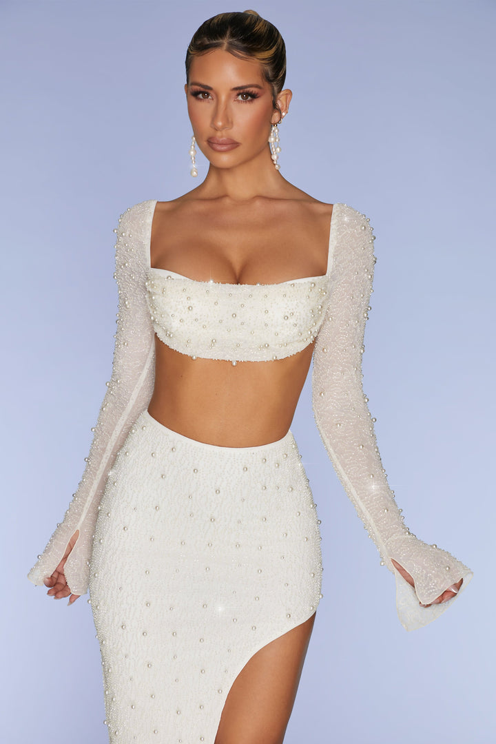 Fildişi Rengi Süslemeli Kapüşonlu Kısa Üst