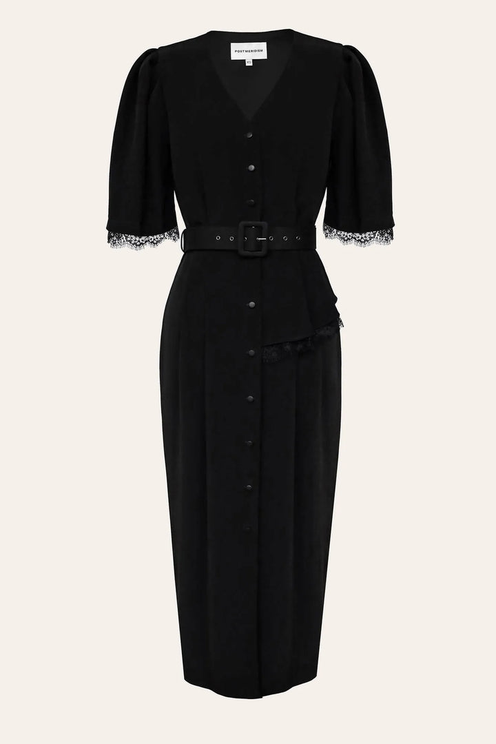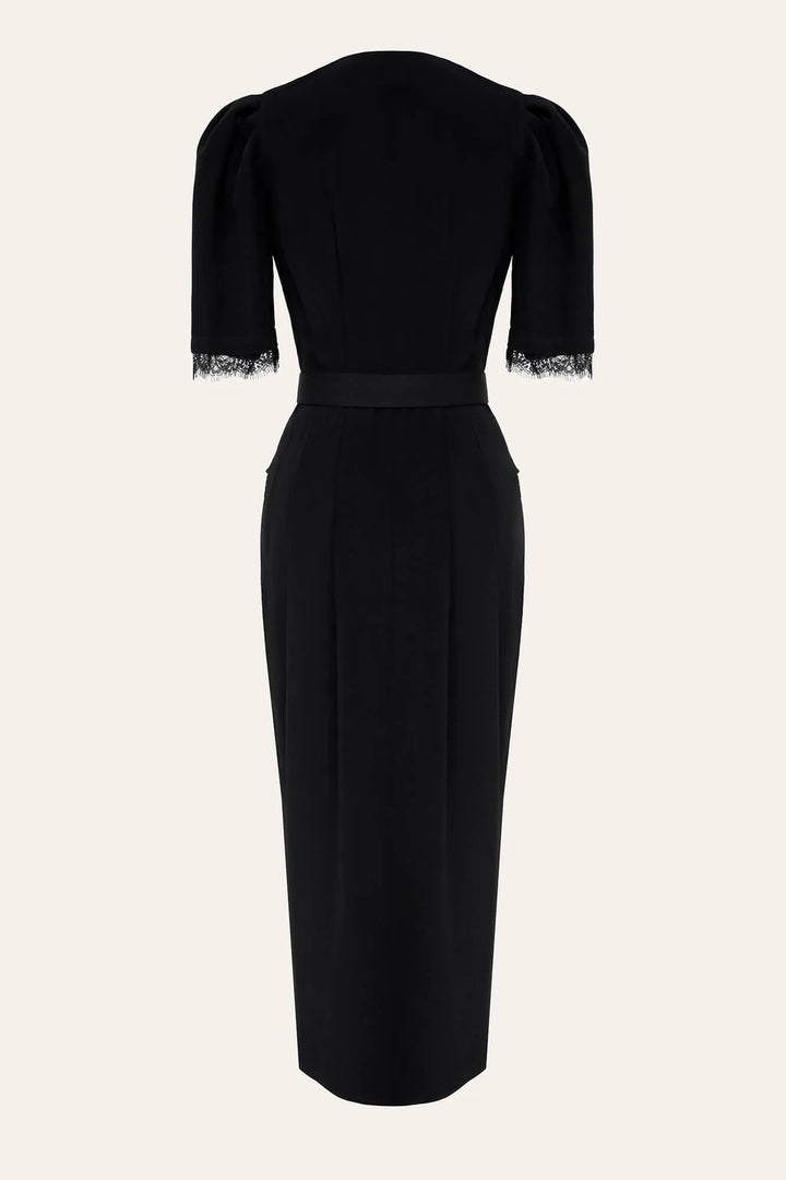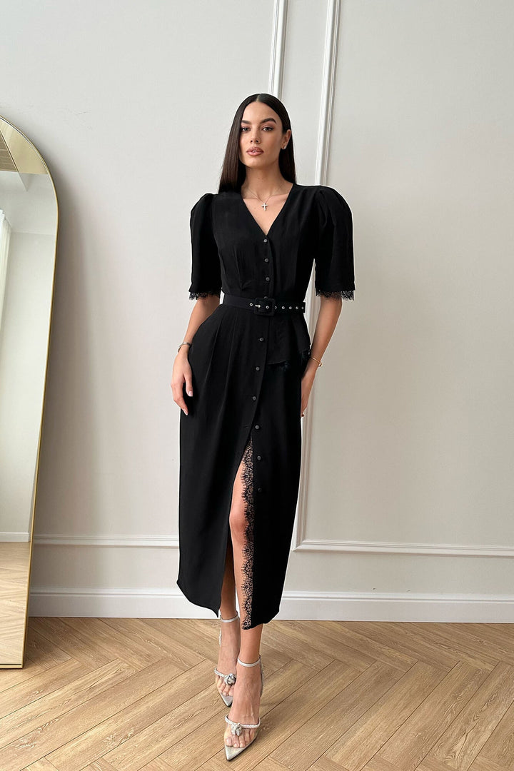 Dantel Süslemeli Önü Düğmeli Midi Elbise