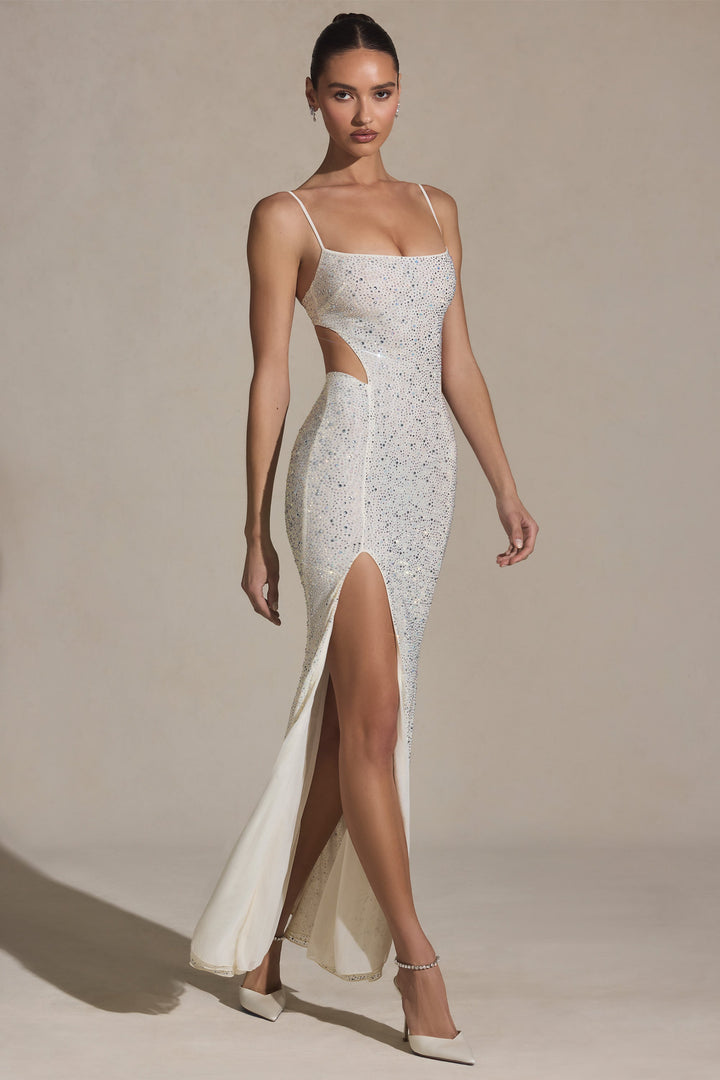 Beyaz Renkli Süslemeli Kesik Balık Kuyruğu Uzun Elbise