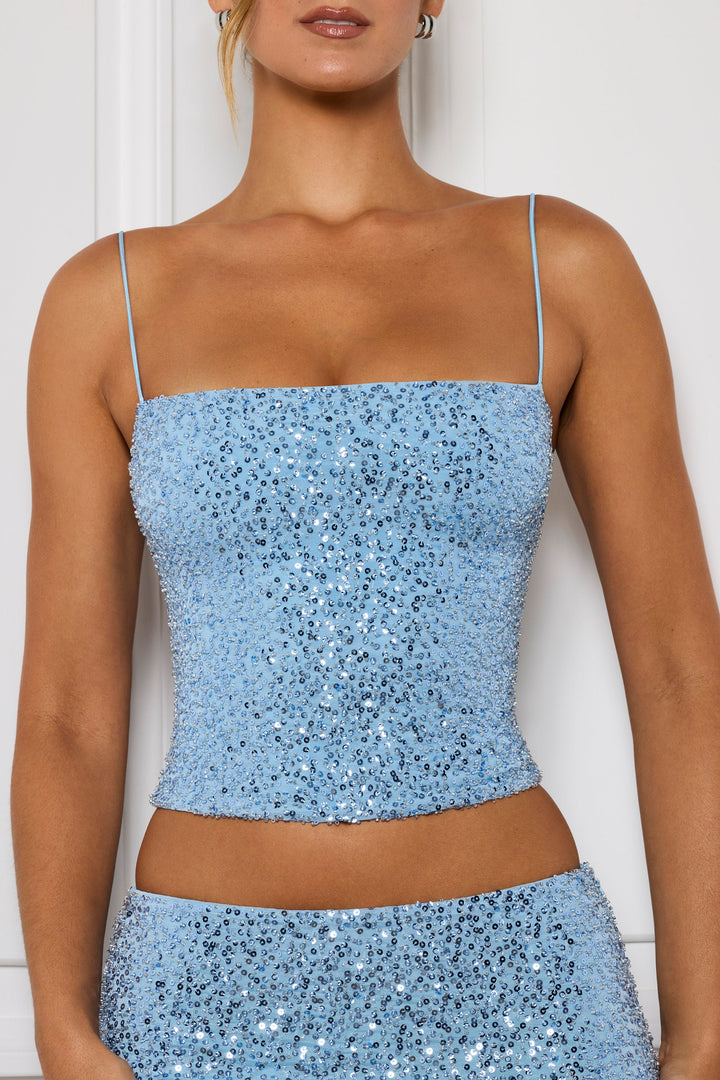 Açık Mavi Renkli Süslemeli Kare Yakalı Üst