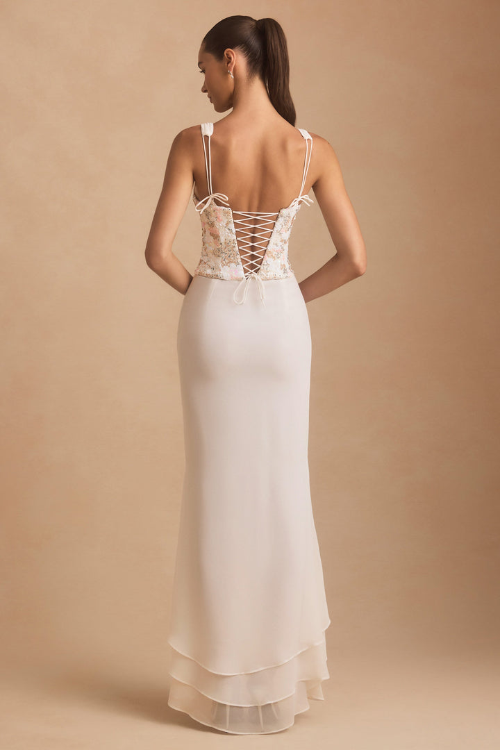 Fildişi Rengi Süslemeli Derin Volanlı Korseli Uzun Elbise