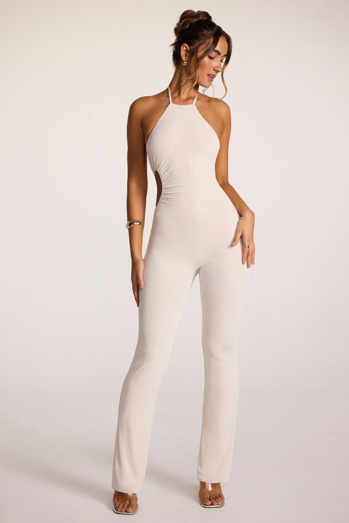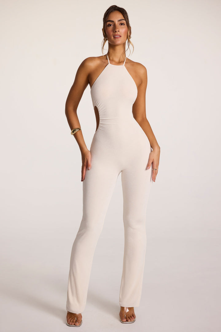 Dokulu Jersey Halter Yakalı Fildişi Kesikli Tulum