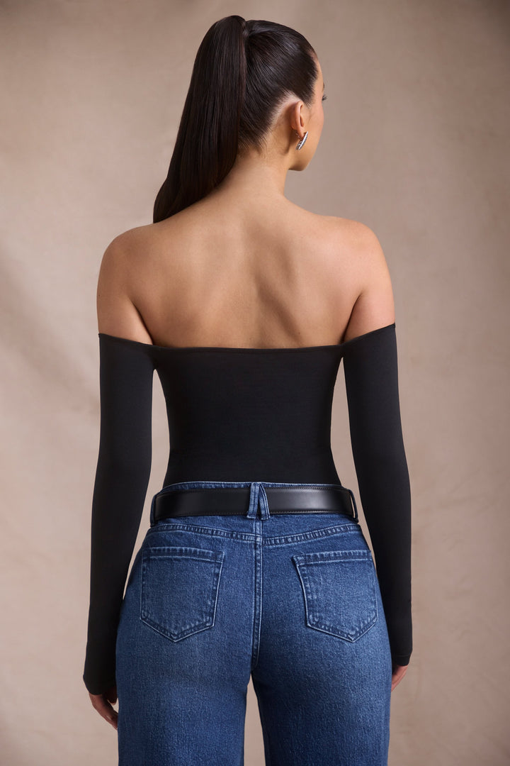 Siyah, Dikişsiz, Omuzları Açık Uzun Kollu Body