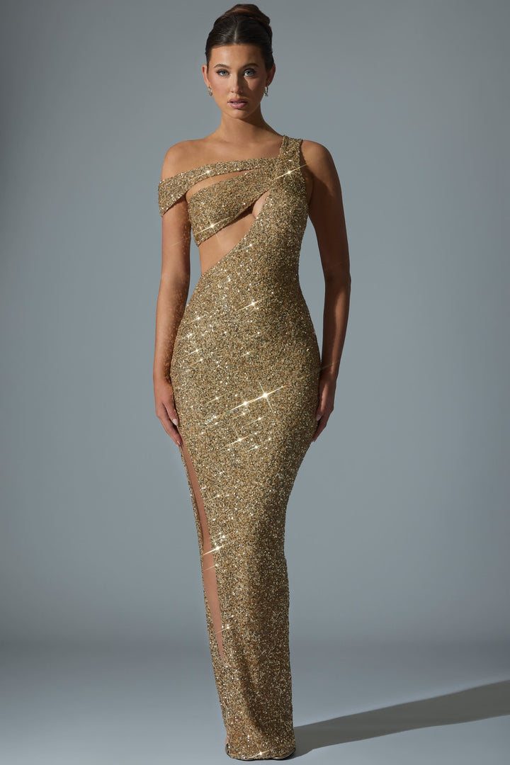 Altın Rengi İşlemeli Asimetrik Kesimli Elbise
