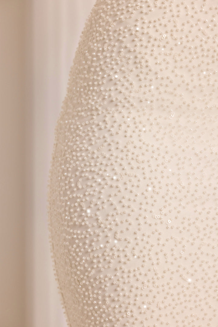 Beyaz İşlemeli Kesimli Uzun Elbise
