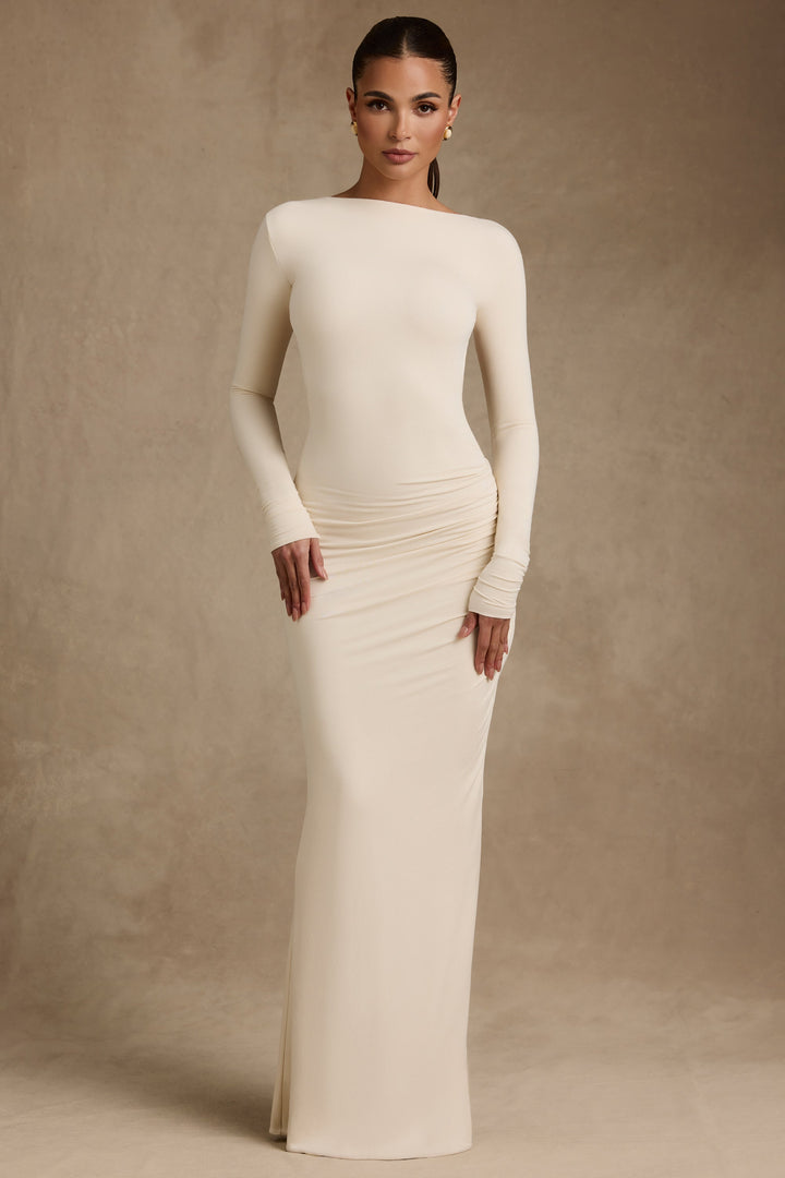 Fildişi Rengi Modal Büzgülü Sırtı Açık Uzun Elbise