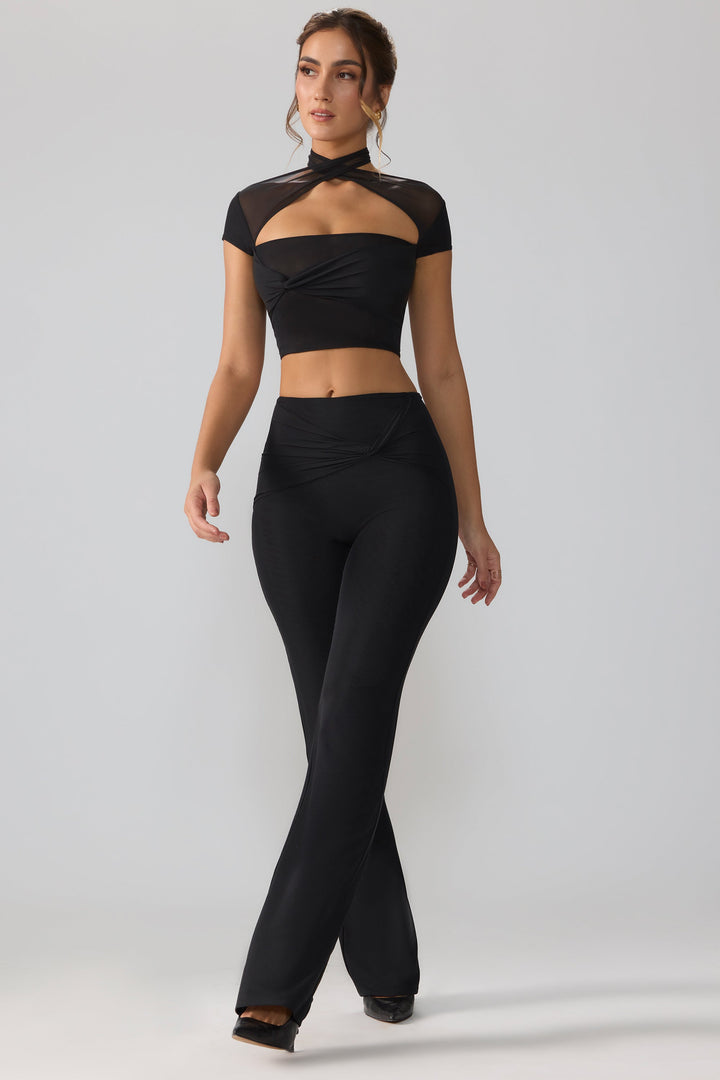 Siyah File Orta Bel Twist Üst Katman Flare Pantolon