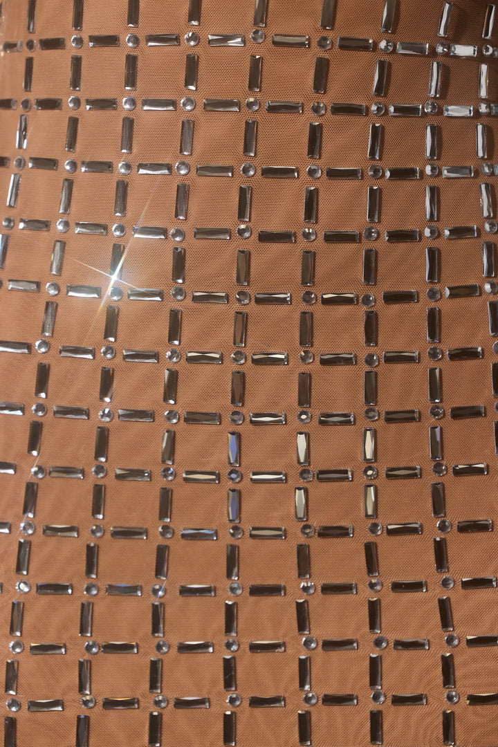 Badem Rengi İşlemeli Derin V Yaka Mini Elbise