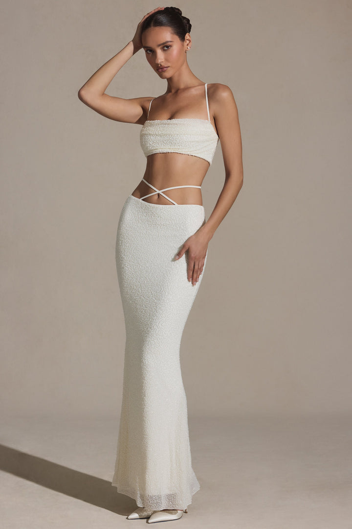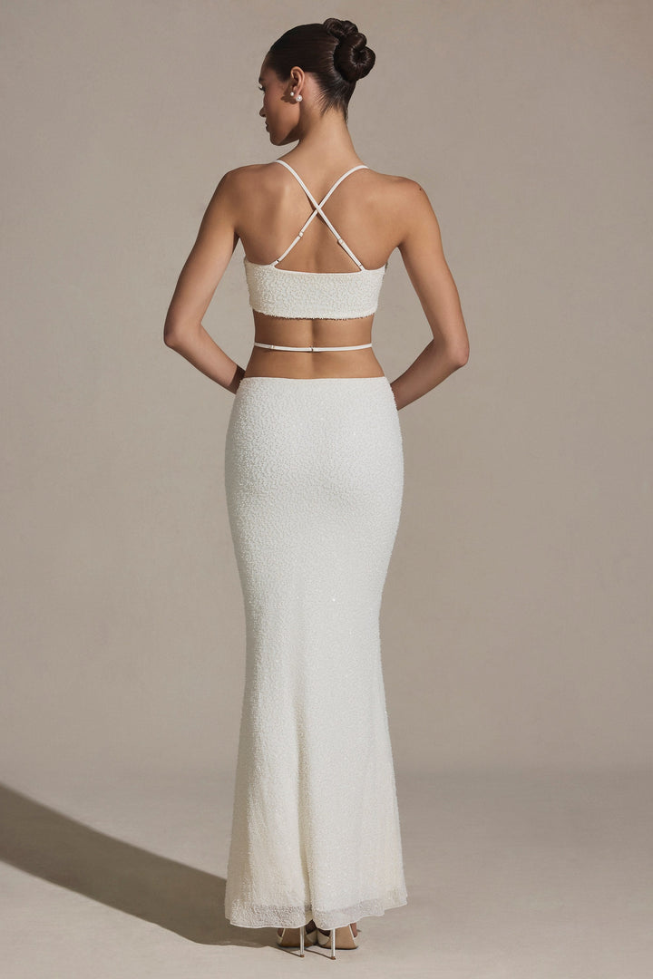 Beyaz Süslemeli Askılı Maksi Etek