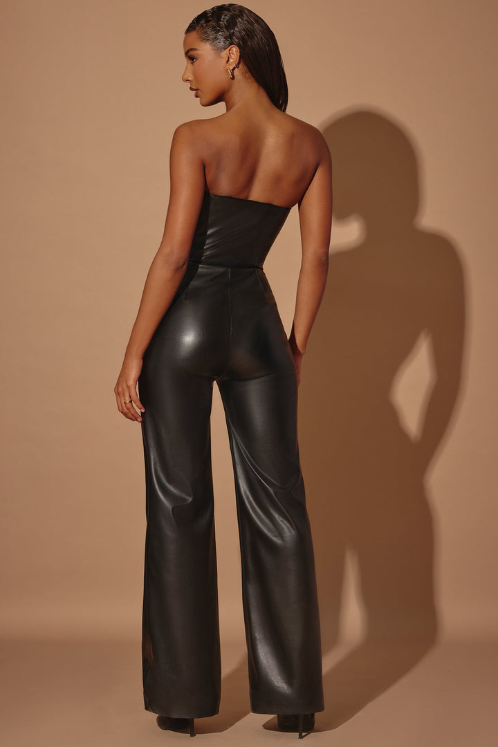 Siyah Küçük Askısız Geniş Paça Vegan Deri Tulum