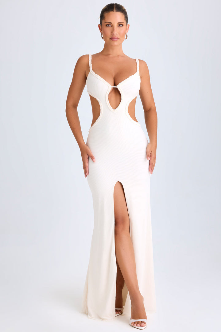 Beyaz Fırfırlı Aplikeli Kesikli Uzun Elbise