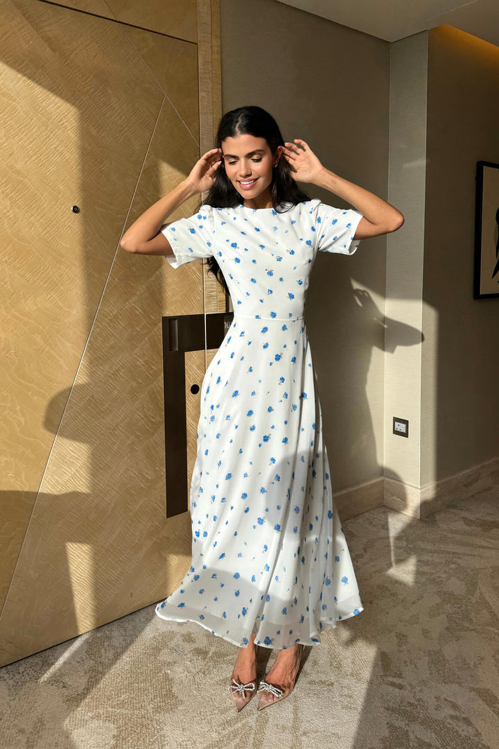 Kısa Kollu Çiçekli Midi Elbise