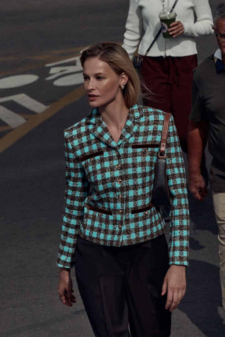 Tek Sıralı Kadife Kenarlı Ekose Ceket