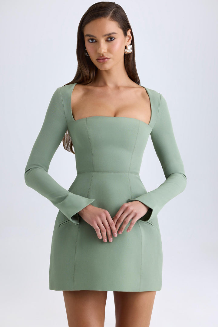 Haki Yeşili Kare Yakalı Yapılı Lale Mini Elbise