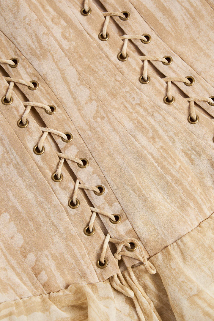 Bağcıklı Volanlı Katmanlı Mini Elbise (Ten Rengi Desenli)