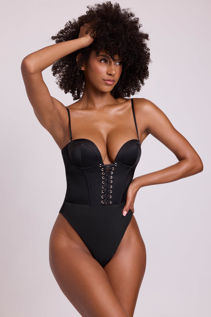 Siyah Saten Derin V Yaka Bağcıklı Korse Bodysuit